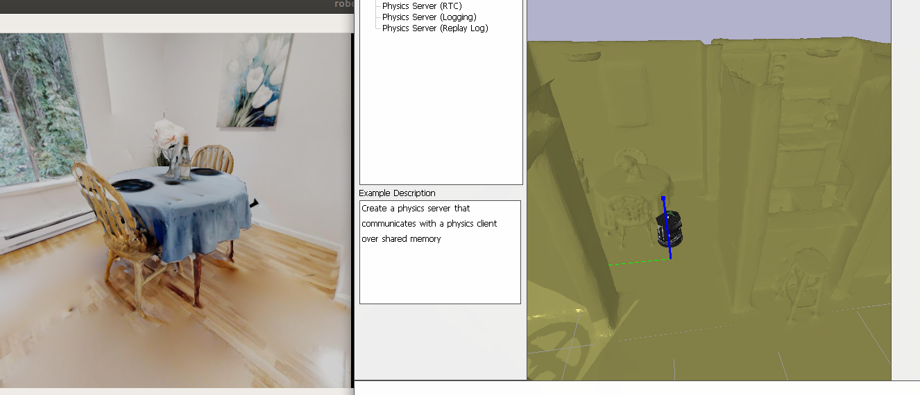 Here we show how to craete a simple simulated environment with one mesh and one robot. Use the config file in gibsonv2/examples/configs/turtlebot_p2p_nav.yaml. This example can be found at examples/demo/simulator_example.py.